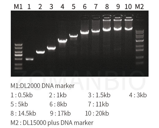 成功擴(kuò)增過:質(zhì)粒、λ DNA 40 kb, cDNA 10 kb, 基因組DNA 21 kb。