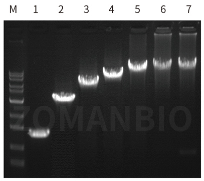 M:DL15000 plus DNA marker 1:人基因組DNA 2:人cDNA 3:玉米基因組DNA 4:菌液 5:菌落 6:λDNA | M:DL15000 plus DNA marker 1:1kb 2:3kb 3:5kb 4:8kb 5:11kb 6:16.5kb 7:21kb |