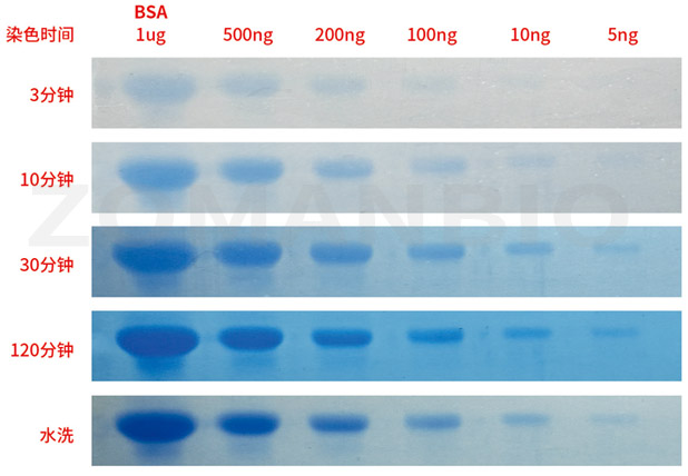 泡染2-10min即可觀察蛋白大小;且安全無毒無刺激性氣味。