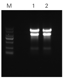 注解: 樣品:細菌DH5α(OD600=1.027) 菌液量為1 ml,50μl 洗脫 M:DL2000(ZOMANBIO) 1,2:莊盟ZP431提取結果 3,4:F公司提取結果 | 注解: 樣品:寄生曲霉 使用液氮研磨后的50 mg樣品,100μl洗脫 M:DL2000(ZOMANBIO) 1,2:莊盟ZP431提取結果 |