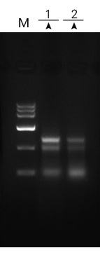 | 1%瓊脂糖凝膠電泳 1:89.2mg小麥莖 2:101.4mg馬鈴薯莖
