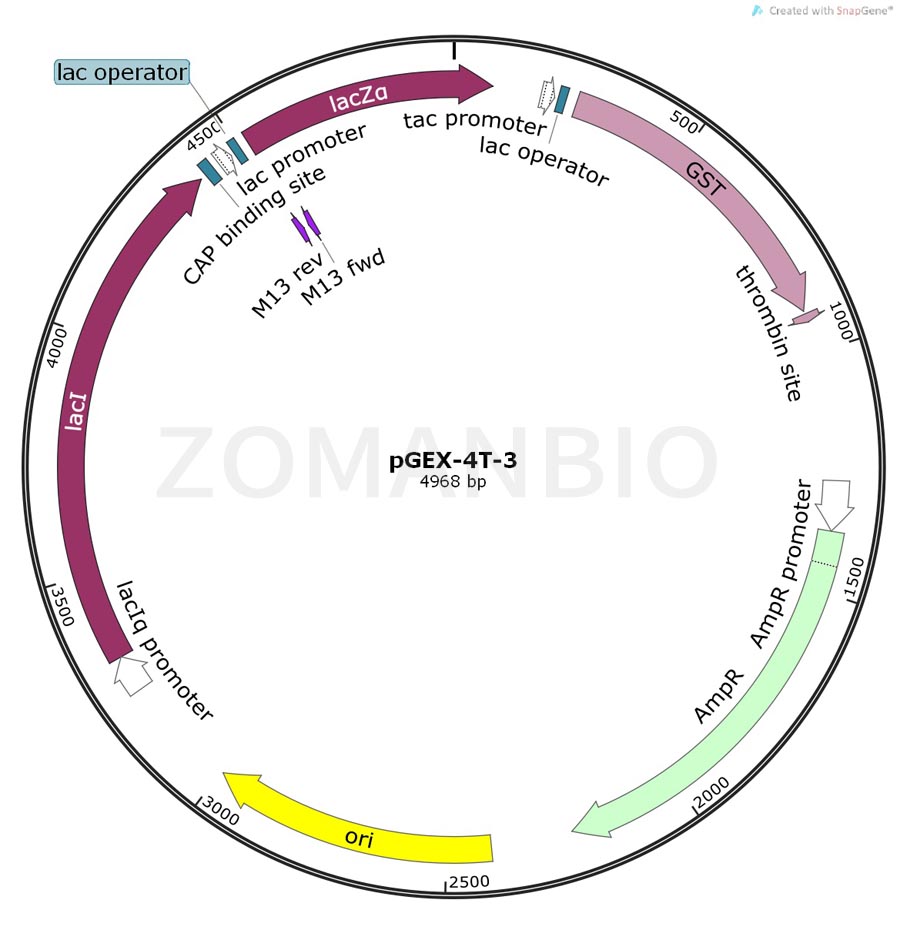 pGEX-4T-3是一個(gè)大腸桿菌表達(dá)載體質(zhì)粒,可通過MCS處的酶切位點(diǎn)連入目的基因,Tac啟動(dòng)子啟動(dòng)GST促溶標(biāo)簽和目的基因融合表達(dá)。質(zhì)粒只保證關(guān)鍵序列正確,不保證表達(dá)效果。