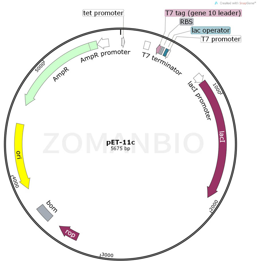 pET-11a-d 載體具有N端T7標簽和 BamH I 多克隆克隆位點。這些載體是很多pET家族載體的前身。pET-21a-d( )系列載體分別對應于 pET-11a-d 載體,但是包含有幾個額外的特征序列。獨特的酶切位點在載體圖譜中被標注出來。需要注意的是,這些載體序列是依據(jù)載體pBR322的方向來進行編號的,所以T7標簽表達區(qū)域在載體圖譜上是反向的。質粒只保證關鍵序列正確,不保證表達效果。