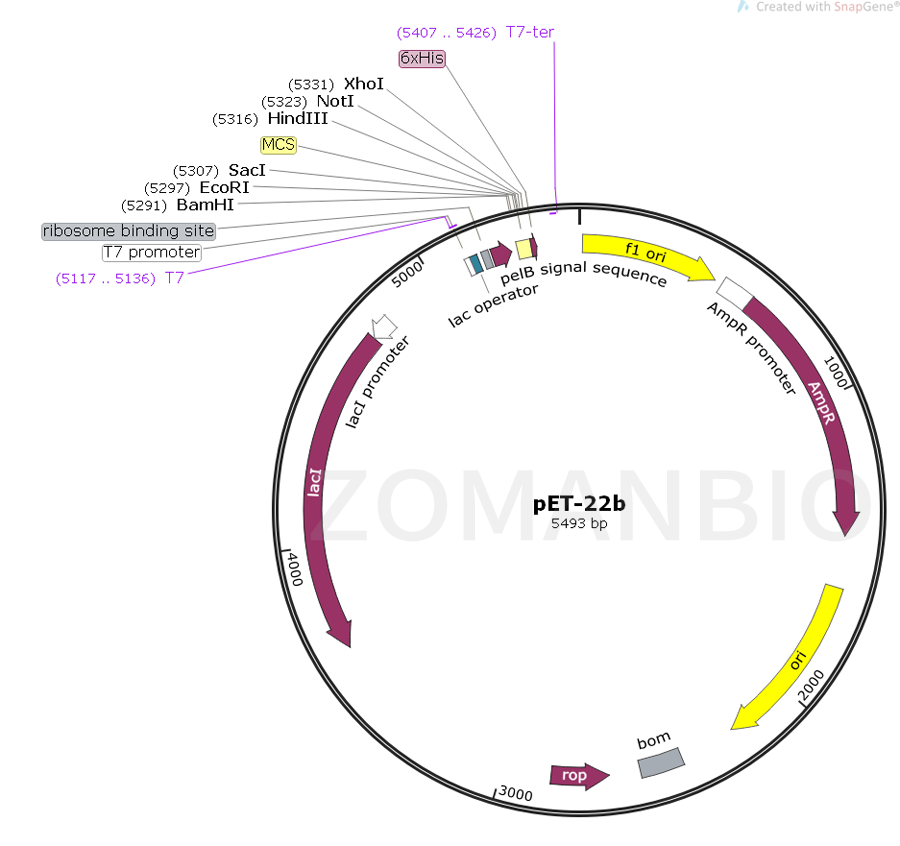pET-22b質粒是一種原核表達載體,N端含有一個pelB前導肽、C-端的His標簽。該質粒含有多個常用的酶切位點,便于不同基因克隆。表達由宿主細胞提供的T7 RNA聚合酶誘導,目的基因被克隆到質粒載體上,受噬菌體強轉錄及翻譯信號控制。T7 RNA聚合酶啟動的克隆和表達區(qū)域在質粒圖譜中也被標注了出來。質粒的F1復制子是被定向的,所以在T7噬菌體聚合酶的作用下,包含有蛋白編碼序列的病毒 粒子能夠產(chǎn)生,并啟動蛋白表達,同時蛋白表達將被T7終止子序列的作用下終止蛋白翻譯。