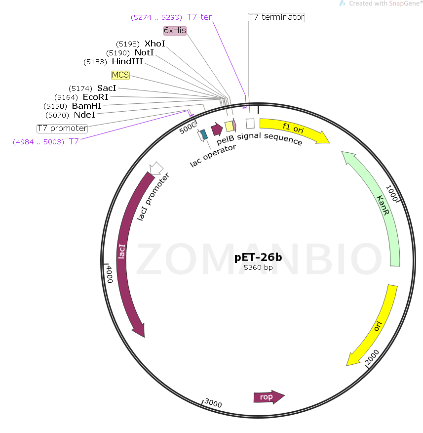 pET-26b質(zhì)粒是一種原核表達(dá)載體,C端含有一個(gè)6×His標(biāo)簽,N端含有一個(gè)pelB前導(dǎo)肽。該質(zhì)粒含有多個(gè)常用的酶切位點(diǎn),便于不同基因克隆。表達(dá)由宿主細(xì)胞提供的T7 RNA聚合酶誘導(dǎo),目的基因被克隆到質(zhì)粒載體上,受噬菌體強(qiáng)轉(zhuǎn)錄及翻譯信號(hào)控制。