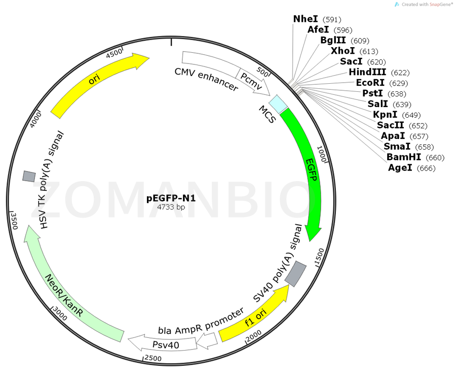 pEGFP-N1 encodes a red-shifted variant of wild-type GFP which has been optimized for brighter fluorescence and higher expression in mammalian cells. (Excitation maximum = 488 nm; emission maximum = 507 nm.) pEGFP-N1 encodes the GFPmut1 variant which contains the double-amino-acid substitution of Phe-64 to Leu and Ser-65 to Thr. The coding sequence of the EGFP gene contains more than 190 silent base changes which correspond to human codon-usage preferences. Sequences flanking EGFP have been converted to a Kozak consensus translation initiation site to further increase the translation efficiency in eukaryotic cells. The MCS in pEGFP-N1 is between the immediate early promoter of CMV and the EGFP coding sequences. Genes cloned into the MCS will be expressed as fusions to the N-terminus of EGFP if they are in the same reading frame as EGFP and there are no intervening stop codons. SV40 polyadenylation signals downstream of the EGFP gene direct proper processing of the 3' end of the EGFP mRNA. The vector backbone also contains an SV40 origin for replication in mammalian cells expressing the SV40 T antigen. A neomycin-resistance cassette, consisting of the SV40 early promoter, the neomycin/kanamycin resistance gene of Tn5, and polyadenylation signals from the Herpes simplex virus thymidine kinase (HSV TK) gene, allows stably transfected eukaryotic cells to be selected using G418. A bacterial promoter upstream of this cassette expresses kanamycin resistance in E. coli. The pEGFP-N1 backbone also provides a pUC origin of replication for propagation in E. coli and an f1 origin for single-stranded DNA production.