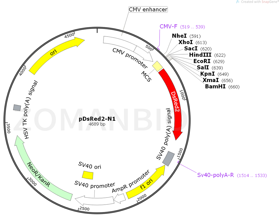 The multiple cloning site (MCS) in pDsRed2-N1 is positioned between the immediate early promoter of CMV (PCMV IE) and the DsRed2 coding sequence. Genes cloned into the MCS are expressed as fusions to the N-terminus of DsRed2. Sequences upstream of DsRed2 have been converted to a Kozak consensus translation initiation site to increase translation efficiency in eukaryotic cells (4). SV40 polyadenylation signals ownstream of the DsRed2 gene direct proper processing of the 3' end of the DsRed2 mRNA. The vector backbone contains an SV40 origin for replication in mammalian cells expressing the SV40 T antigen, a pUC origin of replication for propagation in E. coli, and an f1 origin for single-stranded DNA production. A neomycin-resistance cassette (Neor) allows stably transfected eukaryotic cells to be selected using G418. This cassette consists of the SV40 early promoter, the neomycin/kanamycin resistance gene of Tn5, and polyadenylation signals from the Herpes simplex virus thymidine kinase (HSV TK) gene. A bacterial promoter upstream of the cassette confers kanamycin resistance to E. coli.