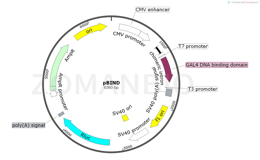 pBIND是高拷貝質(zhì)粒的CMV即刻早期啟動子在其中的驅(qū)動基因表達(dá)的酵母GAL4基因在部分(氨基酸1–147)含有DNA結(jié)合域。的影響的DNA結(jié)合域的序列的載體,是由chimeric flanked多克隆區(qū),內(nèi)含子,終止密碼子和多聚腺苷酸化SV40晚期區(qū)一。該融合基因的T7和T3 flanked區(qū)是由RNA聚合酶的發(fā)起人是目的synthesizing正義和反義RNA的產(chǎn)品,分別。海腎熒光素酶基因的載體,是對本preceded SV40早期啟動子的基因的內(nèi)含子和生長激素。增加蛋白表達(dá)的mRNA的內(nèi)含子可以通過穩(wěn)定的運輸?shù)郊?xì)胞質(zhì)和核(9–12)的影響。合成的多聚腺苷酸序列3′睡的海腎熒光素酶基因。在骨干網(wǎng)中包含了一個F1的質(zhì)粒復(fù)制的起源和生產(chǎn)的單鏈DNA(β-內(nèi)酰胺酶基因在大腸桿菌中的表)的選擇。