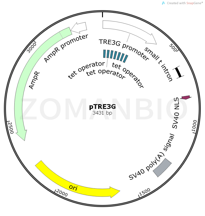 PTRE3G é um sistema de células de mamíferos, a tetraciclina FOI resistente a ampicilina prokaryotic promoter, que é portador de TRE3G, tamanho 3431bp.