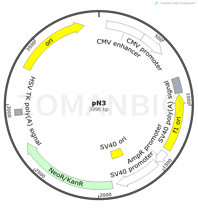 PN3 is a mammalian cell, fluorescent protein reporter vector. Carrier size 3996bp, Neo (G418) can be used for screening.