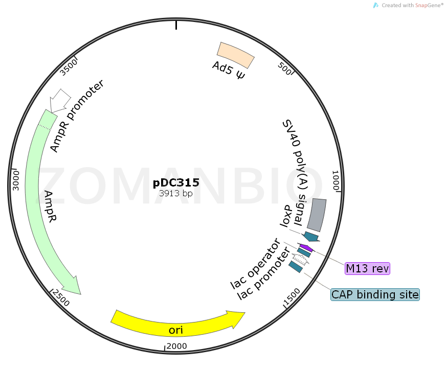 pDC315質(zhì)粒是一種真核表達質(zhì)粒載體,將目的基因插入多克隆位點,轉(zhuǎn)染細胞即可進行表達。 帶有目的基因的 pDC315 可以通過插入位點兩側(cè)的酶切位點以及目的基因內(nèi)部的特異酶切位點進行鑒定。