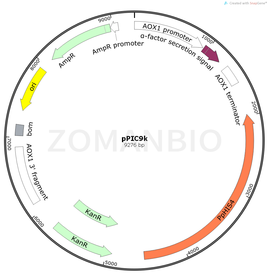 pPIC9K載體中存在卡那抗性基因,允許利用卡那抗性在酵母體內篩選多克隆拷貝。