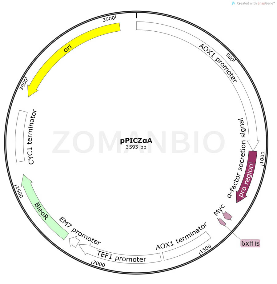 pPICZαA,B和C是3.6 kb的畢赤酵母蛋白分泌表達(dá)載體。表達(dá)的重組蛋白是融合蛋白,含有一個N-端多肽,編碼釀酒酵母(Saccharomyces cerevisiae)α-因子分泌信號。載體能夠在畢赤酵母中利用甲醇誘導(dǎo)的高水 平的表達(dá)目的蛋白,并且可以用在任何畢赤酵母中,包括X33,GS115菌株,SMD1168H,KM71H。pPICZα  A,B和C系列載體包含以下內(nèi)容:①5'端含有AOX1啟動子的嚴(yán)格調(diào)控,利用甲醇誘導(dǎo)表達(dá)任何感興趣的基因(Ellis等,1985; Koutz等人,1989;tschopp等人,1987A)。②α-因子分泌信號能夠分泌性表達(dá)目的蛋白。③Zeocin抗性基因在大腸桿菌和畢赤酵母都能用于篩選(Baron等人,1992; Drocourt等人,1990)。④C-端含Myc和His標(biāo)簽,可以用于檢測和純化重組蛋白。⑤pPICZ A, B, C三種讀碼框使得可以將基因克隆入載體而不發(fā)生任何移碼突變。
