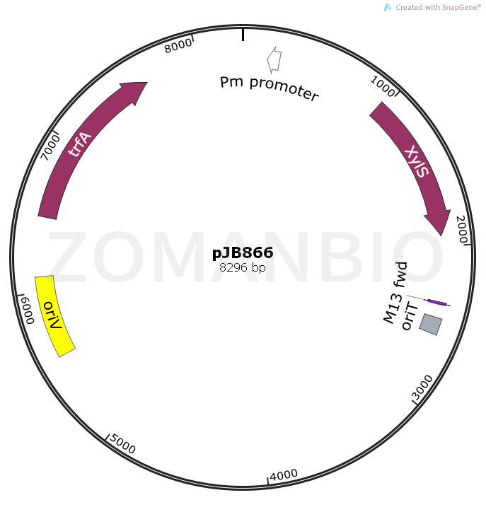 pJB866是一個(gè)革蘭氏陰性菌廣宿主表達(dá)載體,Pm啟動(dòng)子驅(qū)動(dòng)目的基因的表達(dá)。